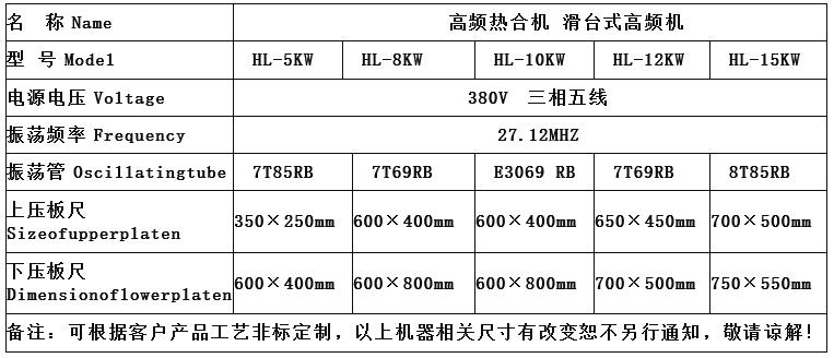 四、高頻熱合機規格參數: