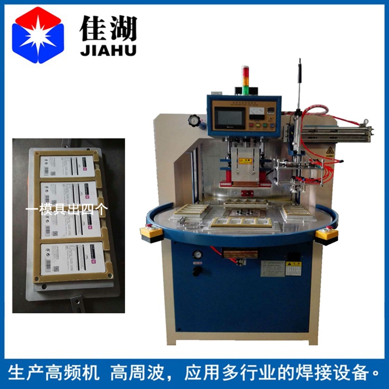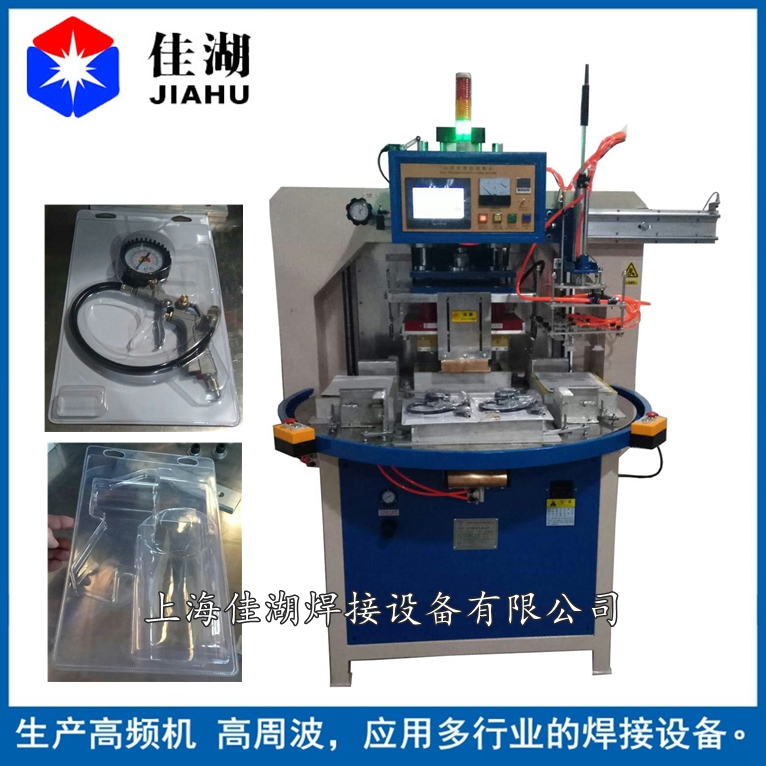 2.自動轉盤式高頻機又簡稱高周波:主要用于含30%以上各種聚氯乙烯(PVC)為主的塑膠熔接、焊接等,并將不同形狀泡罩或泡殼塑膠材質自動焊接同時自動切邊。適用于雙面吸塑焊接,吸塑泡殼與紙卡封合,吸塑包裝(包括上下雙泡罩熱合切邊,泡罩與紙板熱合),各種凹凸形狀的花紋圖案、字母文字的壓制等。全自動轉盤,焊接速度快,適用于大批量紙卡泡殼之間的焊接。可選配帶機械手自動取料,節省人力。