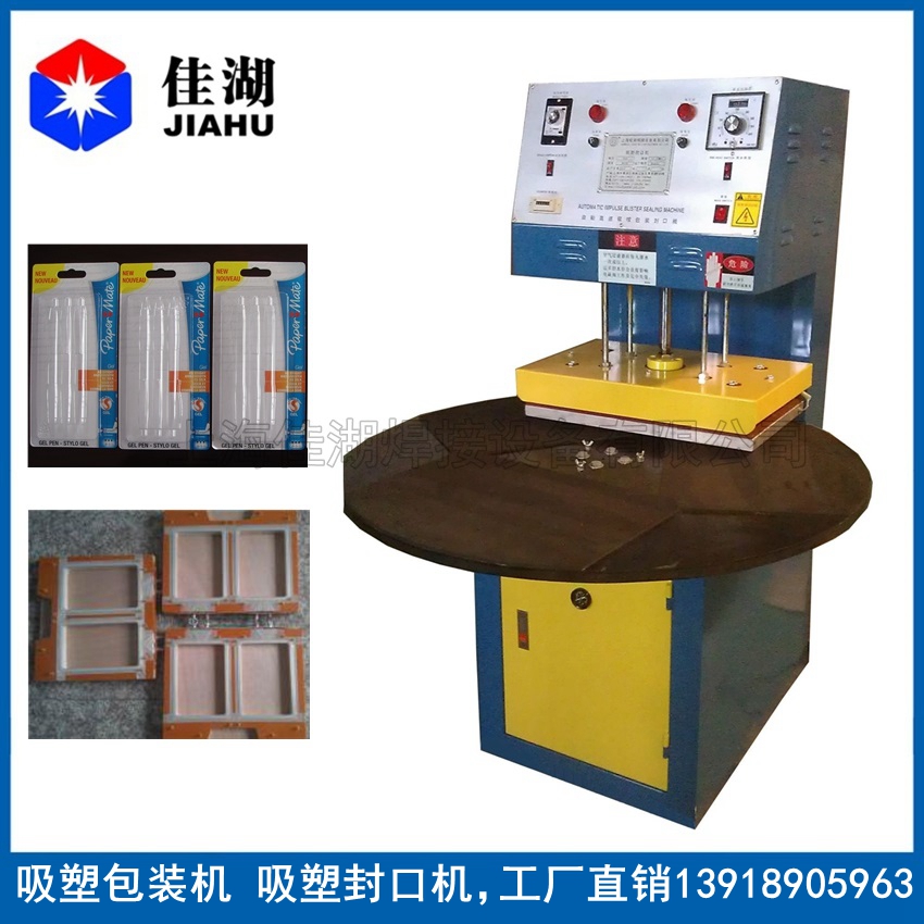 吸塑封口機只需選擇發熱與冷卻時間及電力輸出,用手旋轉工作臺,觸發微動開關,機內的脈沖發熱系統及冷卻系統。