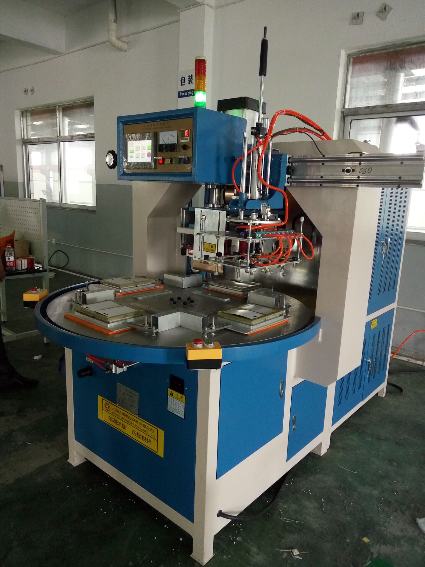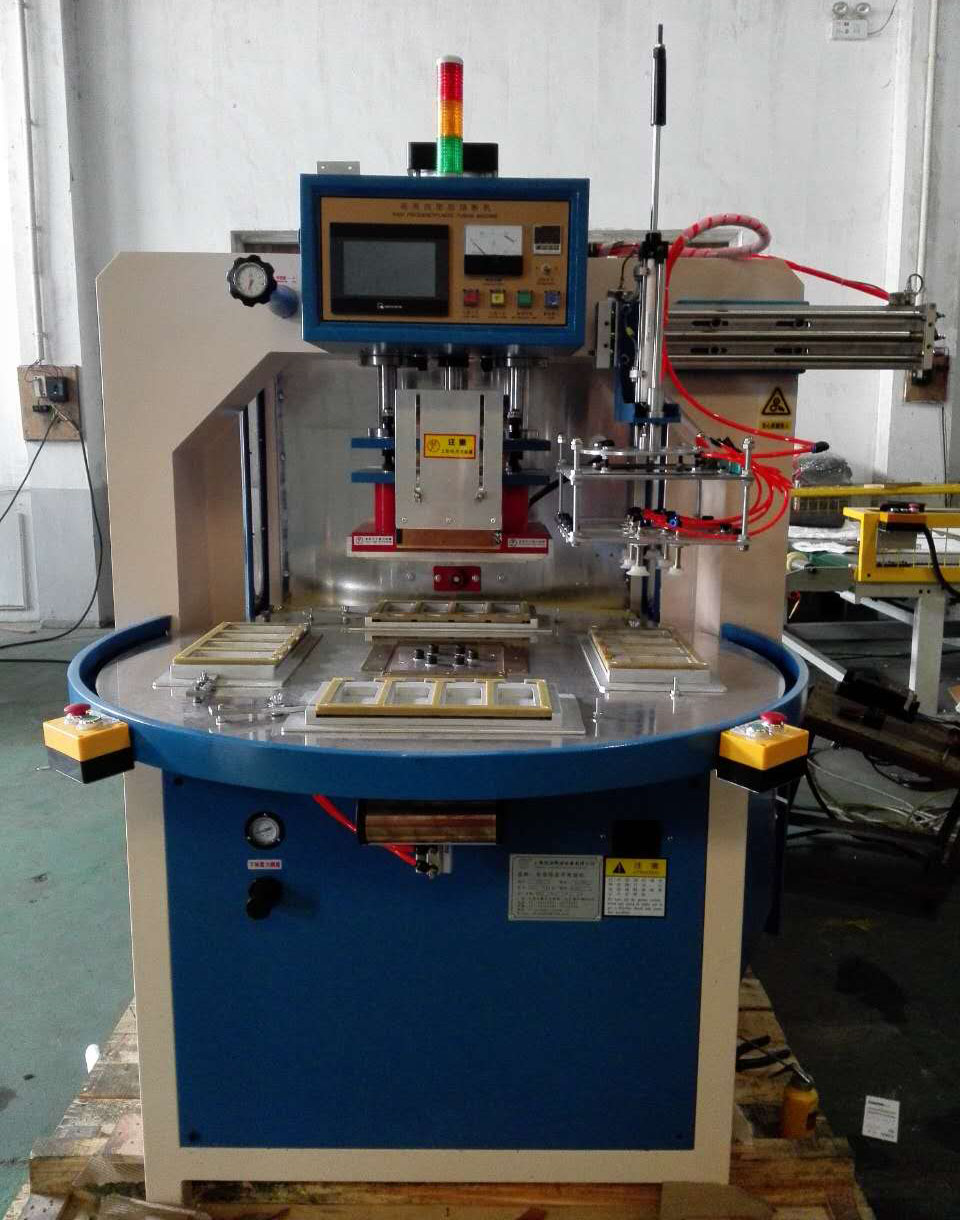 高周波熔接機主要用于含30%以上各種聚氯乙烯(PVC)為主的塑膠熔接、焊接等,并將不同形狀泡罩或泡殼塑膠材質自動焊接同時自動切邊。適用于雙面吸塑焊接,吸塑泡殼與紙卡封合,吸塑包裝(包括上下雙泡罩熱合切邊,泡罩與紙板熱合),各種凹凸形狀的花紋圖案、字母文字的壓制等。全自動轉盤,焊接速度快,適用于大批量紙卡泡殼之間的焊接。可選配帶機械手自動取料,節省人力。