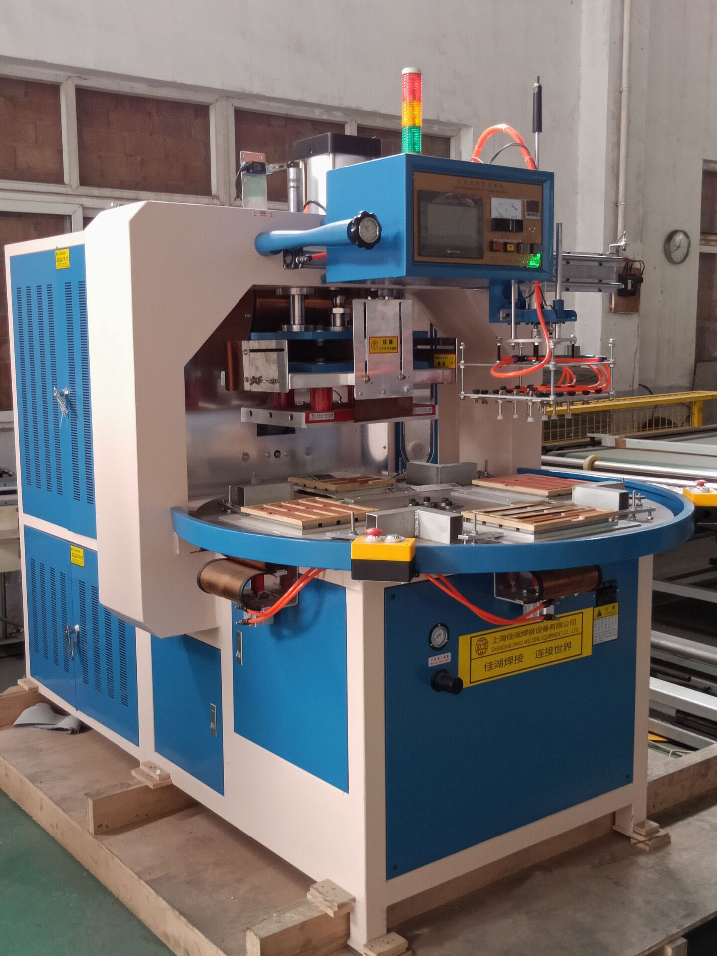 4、自動轉盤高頻機4-6工位可選擇,可根據客戶生產量的需求加裝輸送帶,形成流水線生產。