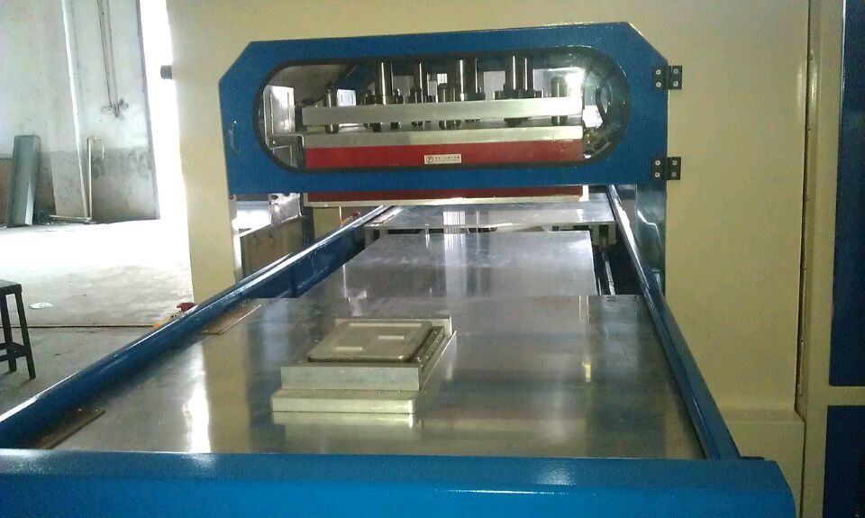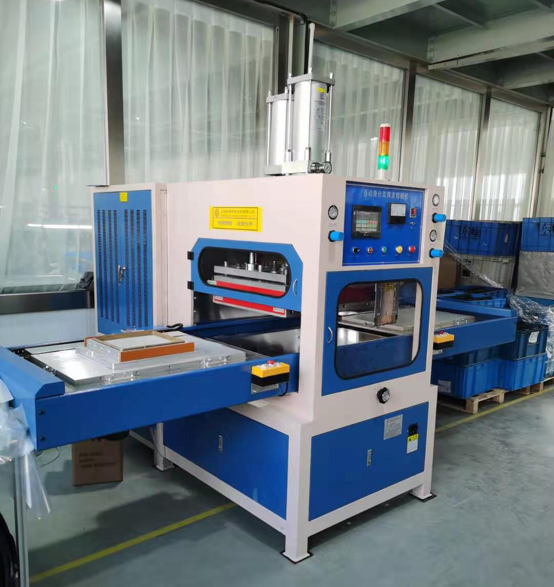 使用工序:該機型帶自動滑臺裝置,工作時通過滑臺輸送產品,進入中間工位,機頭上氣缸自動下降,高頻熔接,冷卻定型(裁斷),機頭上升、滑臺自動退出,手工取出成品。左右工位可利用拿放產品的時間差交替工作。、